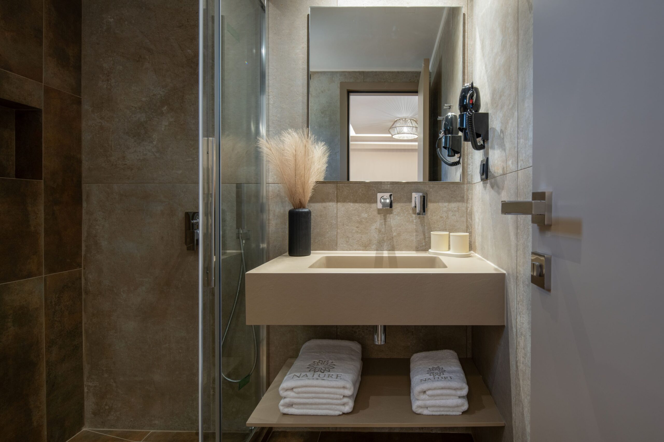 Το μπάνιο είναι ένας χώρος αφιερωμένος στην περιποίηση και τη χαλάρωση. Οι καθαρές γραμμές και οι μοντέρνες λεπτομέρειες δημιουργούν μια ατμόσφαιρα ηρεμίας και φρεσκάδας. Μέσα σε αυτό θα βρείτε όλα τα αναγκαία είδη καθώς και στεγνωτήρα μαλλιών.