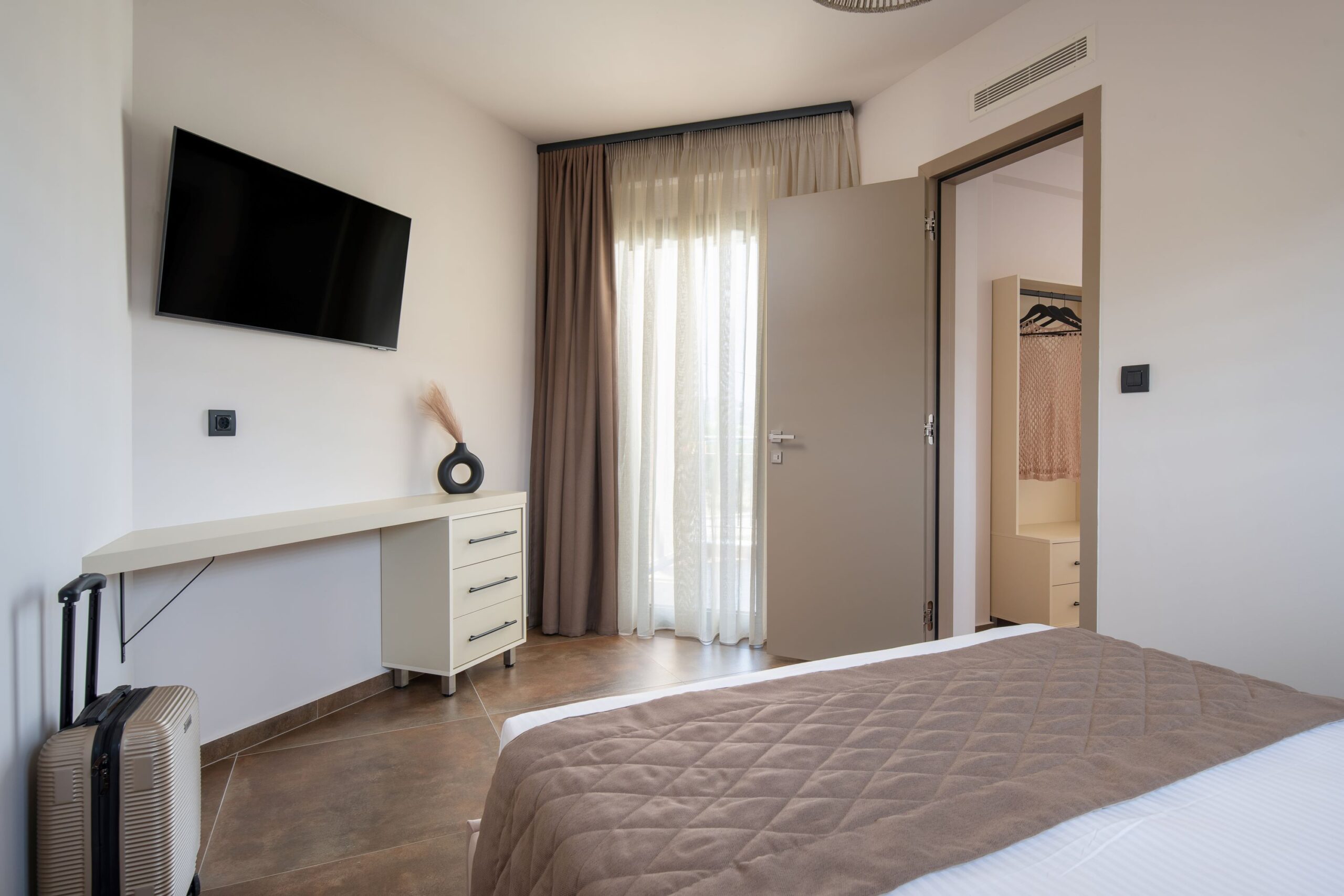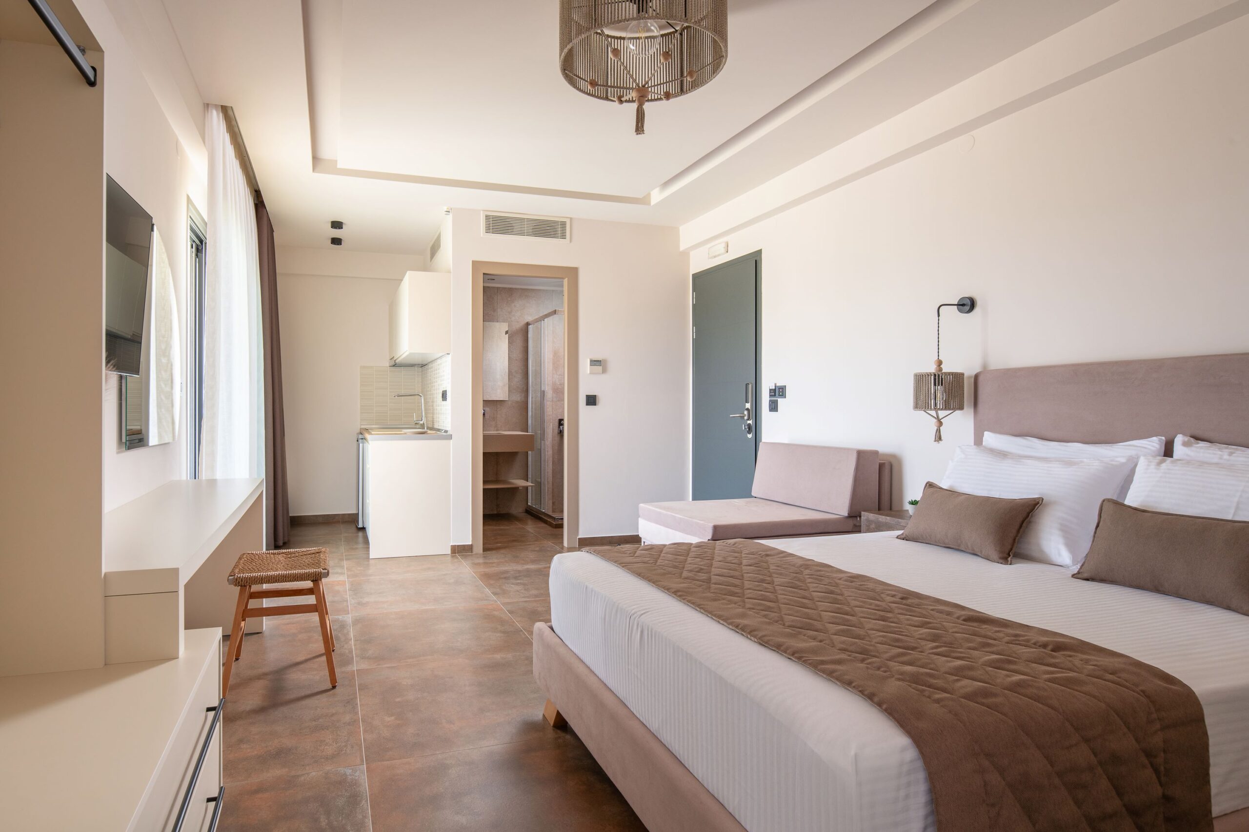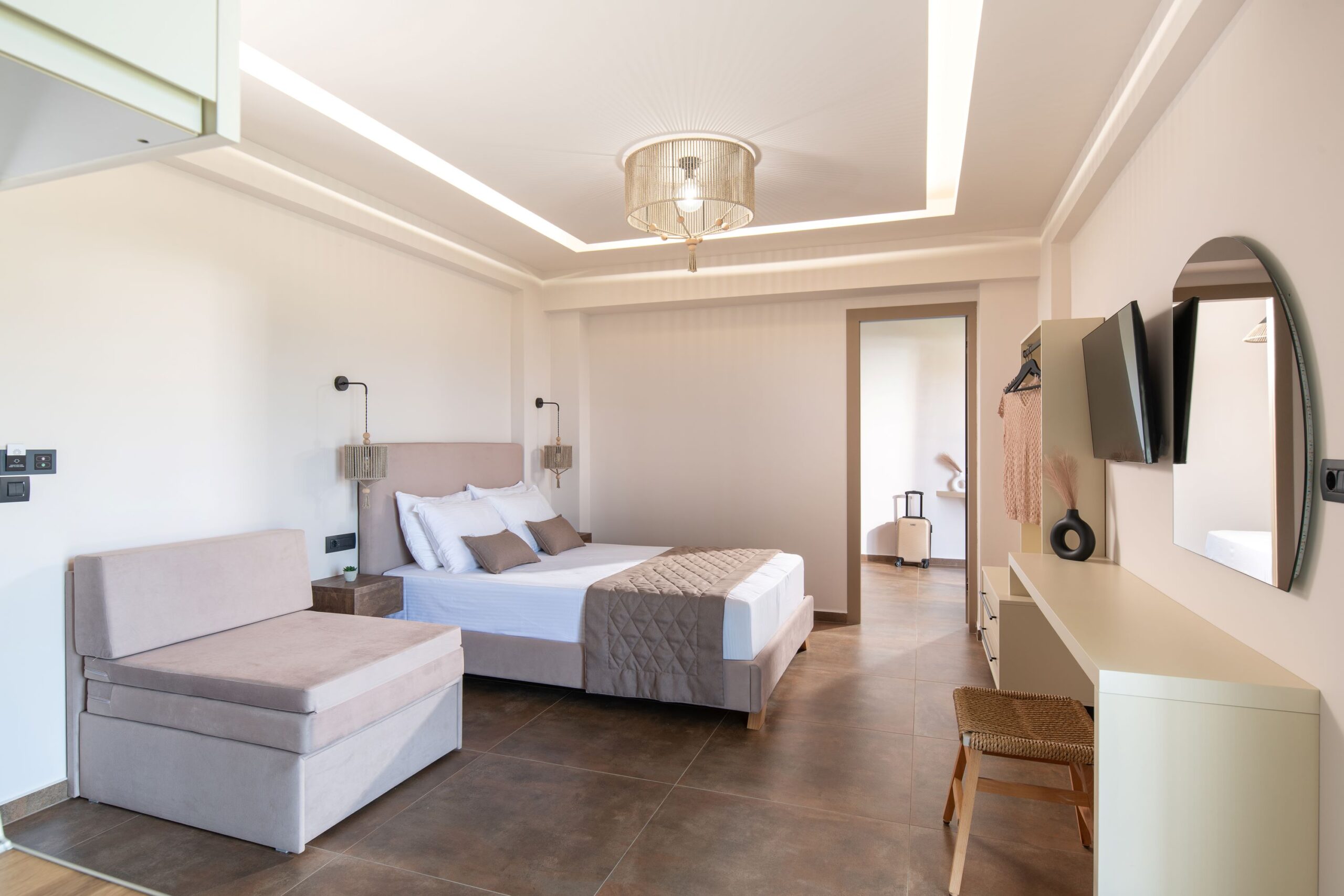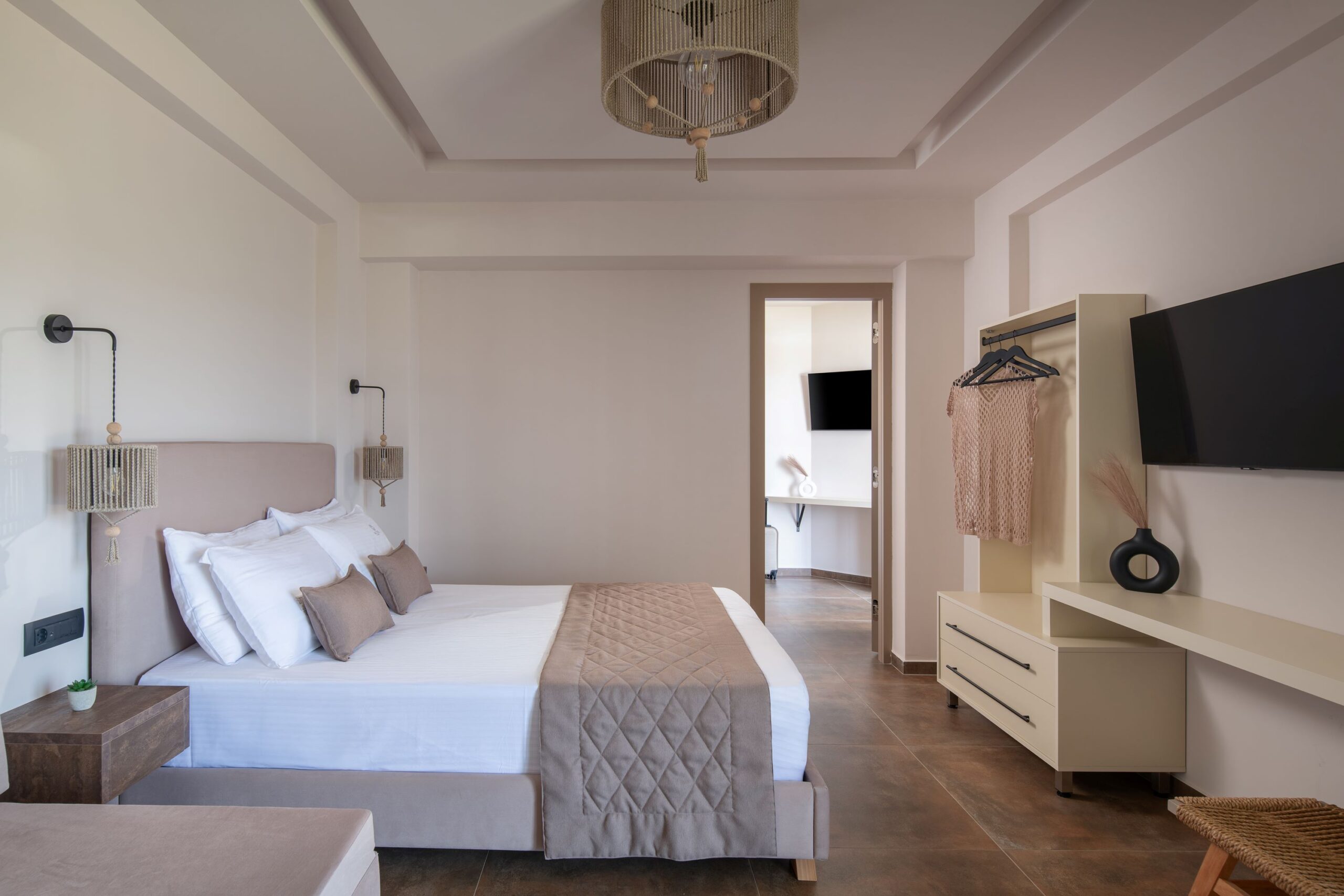 Το οικογενειακό μας δωμάτιο αγκαλιάζει τις αισθήσεις σας με την boho-chic ατμόσφαιρα που δημιουργεί. Με φωτεινά χρώματα και φυσικά υλικά, δημιουργείται ένας χώρος που προσκαλεί σε αναζήτηση και χαλάρωση. Το διαμέρισμα αποτελείται από δυο υπνοδωμάτια εκ των οποίων το ένα διαθέτει ένα διπλό κρεβάτι ενώ το master bedroom διαθέτει ένα διπλό και έναν καναπέ κρεβάτι. Τα κρεβάτια με τα premium κεντημένα κλινοσκεπάσματα, περιβάλλονται από υφάσματα με ανατολίτικα μοτίβα και παστέλ αποχρώσεις, δημιουργώντας έναν χώρο απόλυτης άνεσης και γοητείας.
