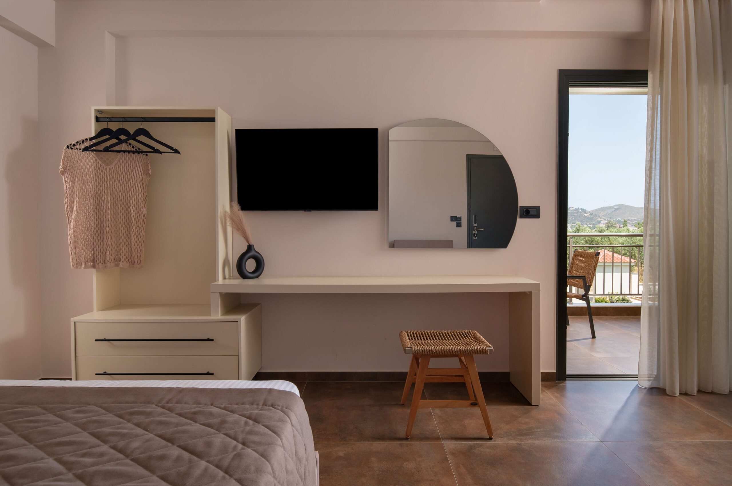 Το μπαλκόνι, με την πανοραμική θέα του στην πισίνα, είναι ένας παράδεισος απόλυτης χαλάρωσης και απόλαυσης, όπου μπορείτε να απολαύσετε τον καφέ σας το πρωί ή ένα ποτό το βράδυ κάτω από τα αστέρια.
